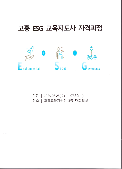 ESG가 무엇인지도 제대로 모르고 고흥군교육지원청에서 문자가 와서 시간이 되어서 무작정 신청하여 듣고 있습니다. Environmental, Social, Governance. 즉, 환경, 사회, 지배구조. 뭐 이런 것이 중요하다는 이야기 같은데, 아직도 잘 모르겠습니다. 차차 알아지겠지요. 이번 주까지 3차 교육을 받았는데, 7월 30일까지 3차가 더 진행되는 총 6차 교육입니다. 크게 무엇을 얻지는 못하겠지만 제 삶에 또 무슨 의미가 있지 않을까요? 앞으로 다시 ESG에 대하여 언급할 날이 왔으면 좋겠습니다. 그때까지 열심히 배워보겠습니다.