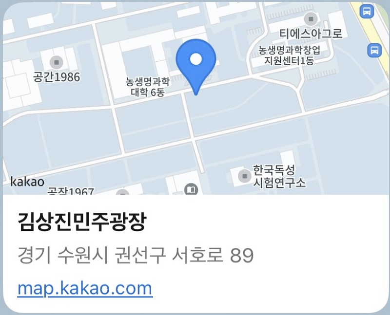“김상진민주광장”이 카카오지도(네비게이션)에 등록되었다. 방문시 카카오지도에서 ‘김상진민주광장’을 검색하면 지도 및 길안내가 나와 편하게 방문할 수 있다. 본회 사무국장은 “카카오지도 등록을 위해 카카오에 재직중인 이준환회원(생자공 99)이 도움을 주었다”며 감사를 전했다.