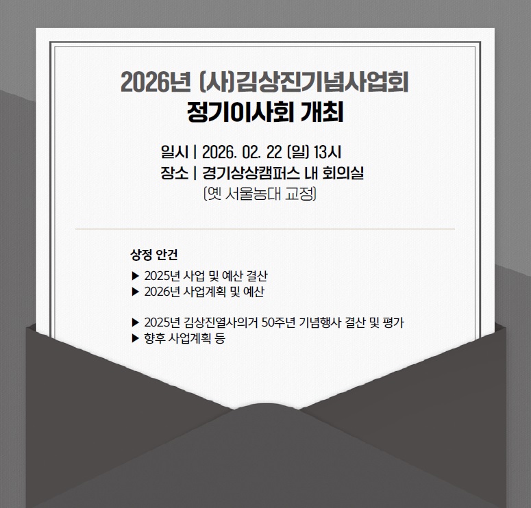 2025년 사업 및 예산 결산, 2026년 사업계획 및 예산 등 안건이 상정된 이번 정기이사회는 2025년 김상진열사의거 50주년 기념행사 결산 및 평가, 향후 사업계획 등이 논의될 예정이다.